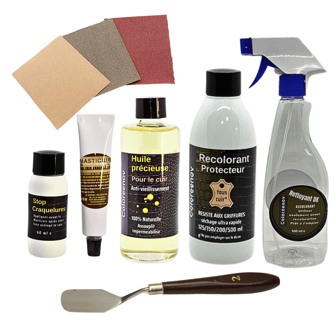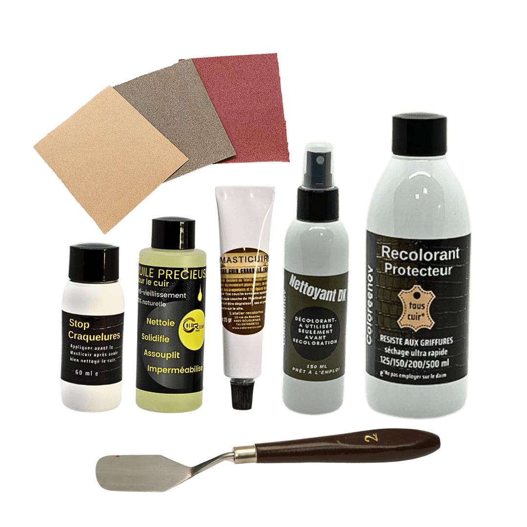 Kits complets de rénovation cuir auto Coloreenov – Nettoyer, réparer, nourrir et recolorer vos sièges en cuir. Résultat professionnel, durable et souple.