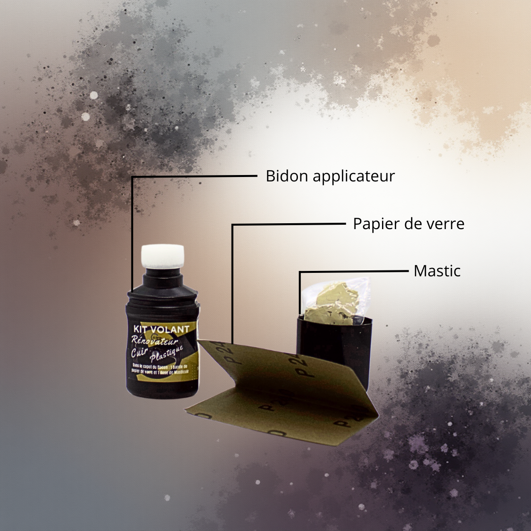Kit Rénovation Volant Coloreenov – Répare et recolore votre volant cuir, levier et frein à main. Contient Masticuir, papier de verre et recolorant 50 mL. Disponible en plusieurs couleurs.